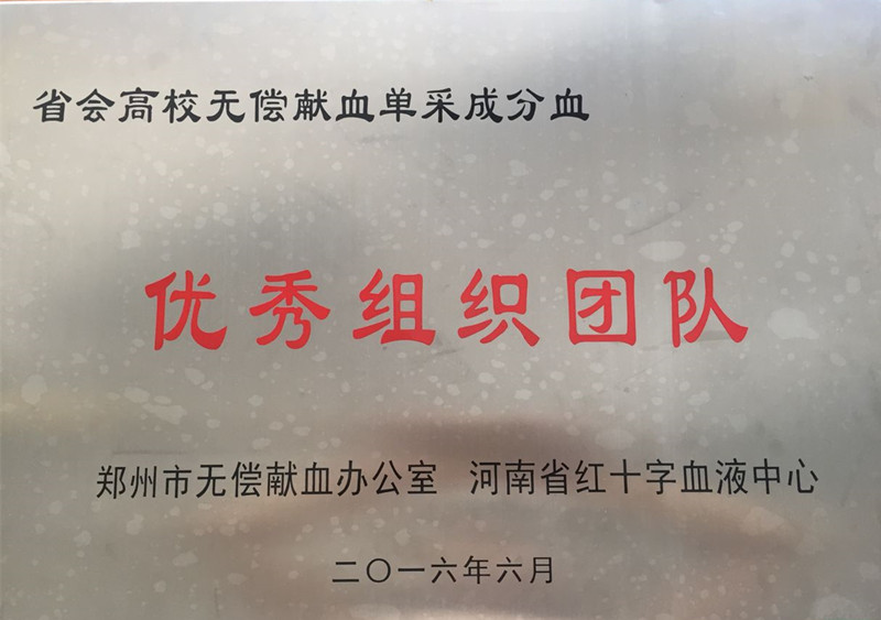 在2016年度无偿献血工作中,能源与动力工程学院无偿献血协会表现突出,效果显著,被河南省无偿献血办公室、河南省红十字血液中心评为河南省会高校无偿献血单采成分血“优秀组织团队奖”称号。