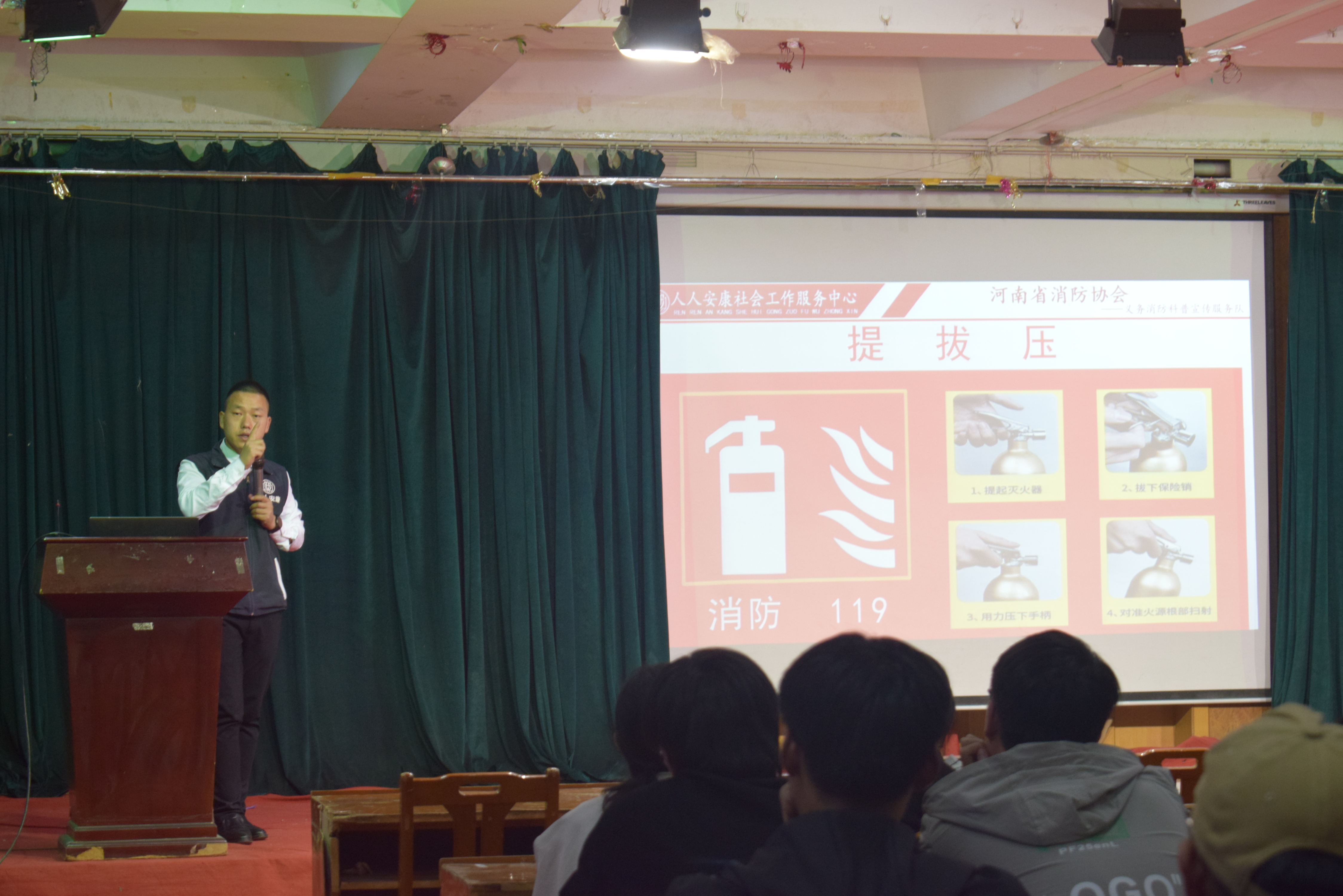 讲座开始,讲师首先向大家列举了近期发生在我们学生身边,因缺乏相关消防知识而发生的惨痛“悲剧”,发人深省。然后向大家讲解了基本的消防知识,涉及火灾发生的原因、怎样预防火灾、火场逃生基本知识、以及如何正确报警等内容。最后结合消防安全制度以及各类火灾案例,对如何树立公共消防意识、预防、杜绝可能发生的消防事故的内外隐患、个人面对突发火灾事故应如何进行救灾和逃生等方面进行了全面的讲解。在讲解的过程中,讲师从理论上教育大家应提高消防安全意识,并且通过亲自示范如何正确使用灭火器和其他求生工具,来帮助大家切实体会具备基本消防安全知识和技能的重要性。
