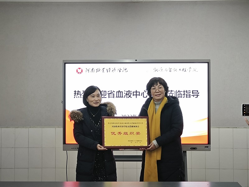 院党委副书记党美珠首先对张淑琴主任一行的到来表示了热烈欢迎。张淑琴主任为我院无偿献血协会颁发“省会郑州高校单采成分血团队无偿献血科普宣传优秀组织奖”。她表示:此次河南省红十字血液中心联合省会郑州九所高校举办血液知识线上答题活动,williamhill威廉希尔无偿献血协会广泛动员、积极参与、答题成绩名列前茅,荣获“省会郑州高校单采成分血团队无偿献血科普宣传优秀组织奖”,感谢williamhill威廉希尔无偿献血协会对大学生无偿献血科普宣传所做出的工作和努力,对此次协会的获奖表示热烈的祝贺!近期,受天气寒冷等因素影响,全省采供血工作面临严峻考验,血液采集量大幅下降,临床血液供需矛盾不断加剧。我们省红十字血液中心呼吁各大高校积极动员广大青年大学生积极参与无偿献血活动,以挽袖之力,奉献热忱爱心。
