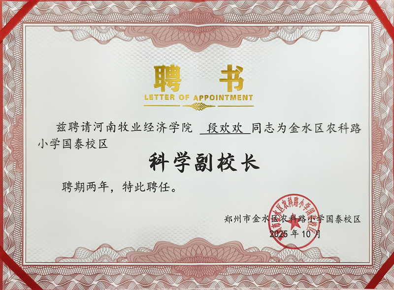 近日,我院青年博士段欢欢受聘为郑州市农科路小学国泰校区科学副校长。段欢欢博士为工科背景,能源与动力工程专业教师,现任河南省制冷学会科宣部部长、郑州市首批中小学科学顾问专家,在能源领域具有扎实的专业基础。
