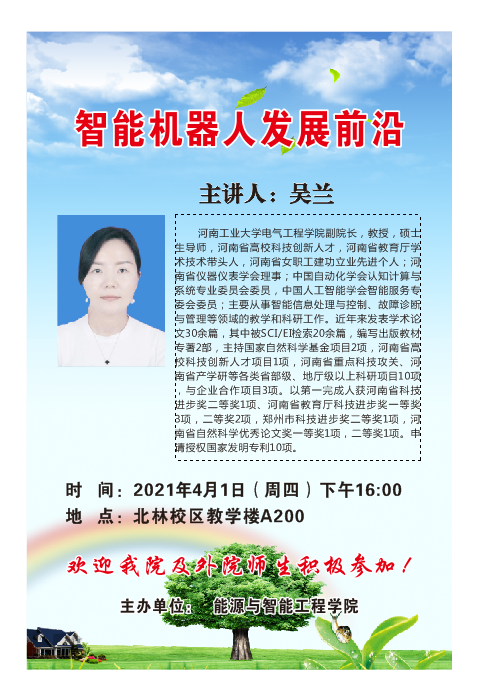 2021年4月1日(周四)下午16:00河南工业大学电气工程学院副院长吴兰教授将来我院做智能机器人发展前沿专题讲座,讲座地点北林校区教学楼A200,欢迎广大师生前来聆听。