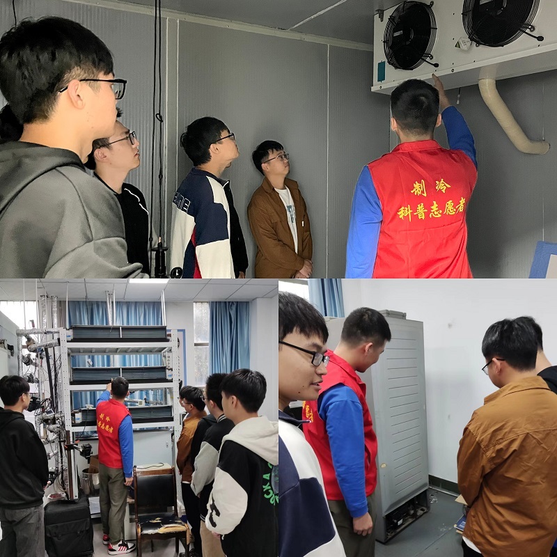 2023年9月23日,同学走进制冷实验室,制冷协会科普志愿带领同学们参观制冷实验室,并讲解家用空调、中央空调、冷库等相关知识,使同学们对制冷设备的结构、技术要求、使用性能有了较深的认识