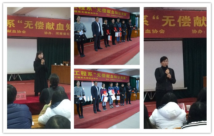 最后,杨莉老师和张淑琴科长分别对本次竞赛进行了点评。杨老师说,我校无偿献血协会成立17年来,为河南省高校无偿献血事业、校园文化建设做出了很大贡献,为学校荣获了全国无偿献血促进奖、全国校园文化建设优秀成果三等奖、郑州市“1998-2008”十年献血贡献奖等荣誉,也培育了“昆仑山上的护羊倌”王宪领等一大批优秀学子,对此表示感谢,同时也祝贺河南省高校首届“无偿献血知识竞赛”获得圆满成功。张科长说,本次竞赛是河南省血液中心健康知识“走出来”的第一步,感谢williamhill威廉希尔对于河南无偿献血事业的大力支持,也感谢同学们的积极参与,本次竞赛会让同学们对无偿献血知识有了更深、更广、更全面的了解,相信参与公益活动也会让同学们的梦想更美更精彩。
