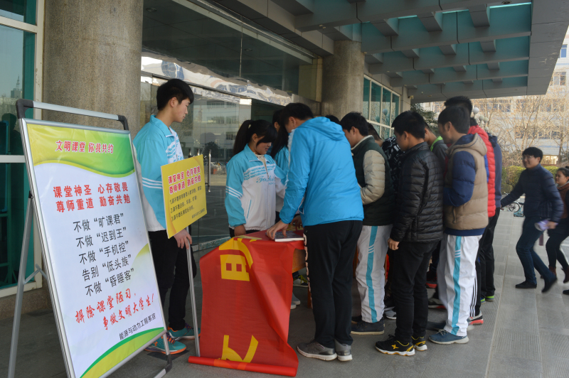“课堂神圣,心存敬畏,尊师重教,勤奋共勉”,“不做手机控,告别低头族,不做昏睡客”等,一块块设计精美的宣传标语矗立在A座大厅,时刻提醒同学们进行学习思考;各班纷纷组织“不做手机控,告别低头族,不做昏睡客”大讨论等活动,为新学期迎来良好开端;“求学礼为先”,“老师好”、“老师再见”感恩于老师的辛苦工作,增进了师生感情,调节了课堂气氛,确保了教学效果。