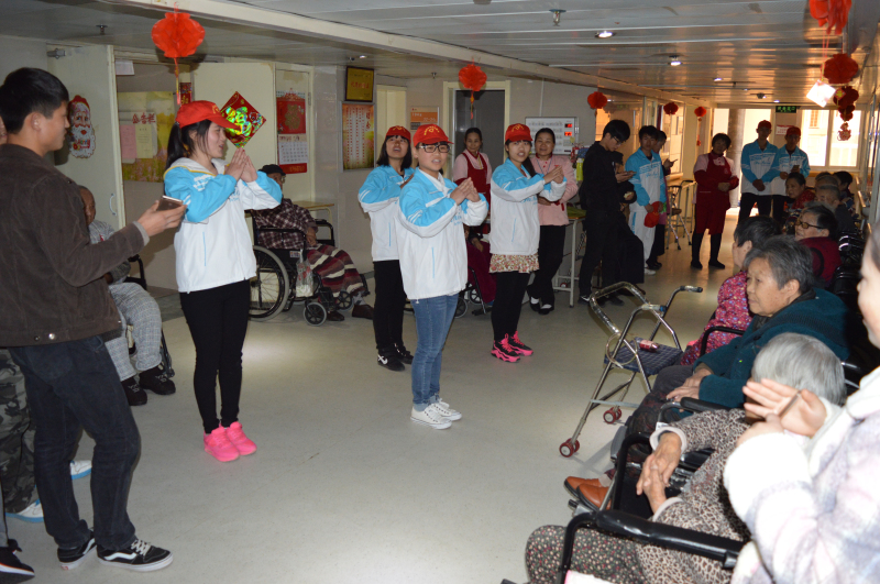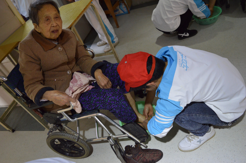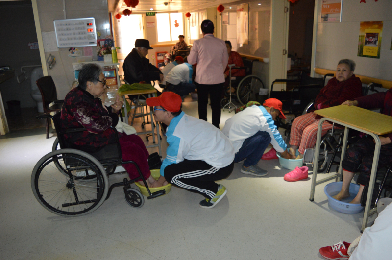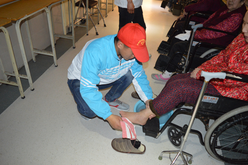 “老吾老,以及人之老”,志愿者们到养老院后为老人洗脚按摩,在工作人员的带领下,为六层、七层的老人们洗脚,志愿者们认真细心,边洗边跟老人们聊天,耐心聆听老人们讲以前的故事,气氛十分融洽,其中一位老人感动得说到:“我自己的孩子都没给我洗过脚……”志愿者们按摩着老人起蛮茧子的双脚,明白这是老人们一生勤劳的印记;随后,志愿者们为老人们准备了精彩的节目,有小合唱《强军战歌》、流行歌曲《父亲》、手语《感恩的心》等,老人们非常高兴,鼓掌称赞;还有一些志愿者们陪老人们下起了军旗、象棋,给老人按摩等等,整个养老院充满着欢笑,涌动着暖流,最后离开时,老人们拉着志愿者们的手,依依不舍。