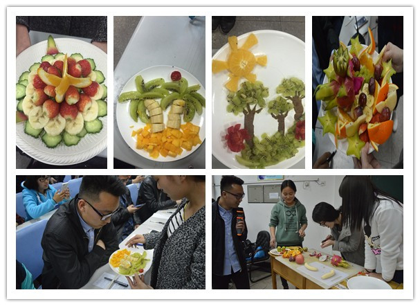 此次美食大比拼活动由“完美刀工”、“颜值果盘”、“创意寿司”三个环节组成。“完美刀工”环节,台上选手们聚精会神、动作娴熟,台下观众静静观看,每有一位选手完成,台下就响起热烈的掌声,其中15级空调班的李涵乐用时最短,切出的土豆丝又细又均匀,赢得了评委的一致认可;“颜值果盘”环节,各组选手有备而来,14级新能源班的作品“带你去看夏威夷”,用香蕉和猕猴桃切片制作出椰子树,芒果切丁作沙滩,呈现出一派热带的景象,深受同学们的喜爱,15级制冷02班的作品“欢乐兔兔家”,用橙子制作成兔子,火龙果壳做兔子的家,另外点缀了心形的火龙果肉、五角星形的杨桃、花朵形的圣女果等8种水果,整个果盘五彩缤纷,堪称这个环节的颜值担当;第三个环节,也是最考验选手水平的一个环节——“创意寿司”,各组选手各显其能,一个个变身美女料理大师,其中14新能源班的作品“春之三部曲”,运用三种不同的手法和食材制作出三类寿司,并用樱花做点缀,非常精致,赛出了专业水平,在这个环节除了评委品尝打分外,还请台下的两位观众试吃打分,各组分数不分伯仲。