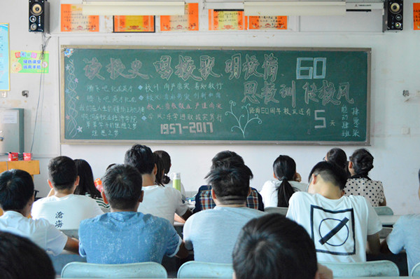 各班采用丰富多彩的方式诠释着对母校的热爱。16能动01班同学们学唱校歌,分组进行比赛,各组用说唱、民族等不同的演唱形式,现场气氛热烈。16能动02班开展的主题演讲比赛,让同学们在欣赏节目的同时感受我校这六十年发展的历程,加深对学校的了解。16太阳能01班的同学们以“我可以为校庆为母校做什么?”为主题展开热烈讨论,“我会参加义务劳动活动,清洁校园,美化校园,为校庆献上绵薄之力”、“我要勤奋上进,以优异的成绩回报母校”、“今天我以学校为荣,明天学校以我为荣”等,同学积极畅谈感受,活动高潮不断。