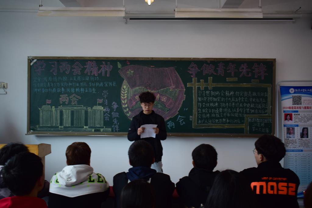 团课伊始,各班团支书通过讲说,帮助同学们更好地理解“两会”精神,并宣读《青春聚力迎评估,献礼建党一百年》,对营造良好的班风、学风、校风提出具体行动要求,为本科评估营造良好开局。随后,20建环01班的张俊婷向同学们介绍了两会的发展史,向同学们普及自1998年第八届全国人大和全国政协召开至现在的知识,每年全国政协均在3月3日、全国人大均在3月5日开幕,使同学们更好的了解两会。20机器人02班的张梦迪进行了题为《争做时代美少年》的演讲,激励同学们用思想武装头脑,坚定理想信念,积极投身中华民族伟大复兴中国梦的新征程中。最后,各班团支书做出了总结,强调了团课中出现的问题,对同学们的积极表现做出了表扬。本次团课在同学们的积极配合下圆满结束。