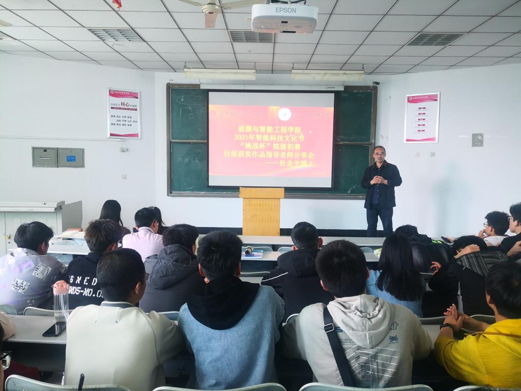 杜金宇老师首先同大家探讨了关于比赛的想法,提出一些参赛建议,鼓励大家要积极认真的对待比赛,通过比赛能够提升自我。随后,杜金宇老师结合自己的参赛经验和获奖历程从题目、产品简介、申请专利、策划书、项目讲解以及作品几个方面进行了详细的解说。向大家传授了一些参赛技巧,如参赛题目要能抓住评委老师的眼球;产品简介要切合实际产品的性能和实用价值;申请专利项目更加具有说服力;策划书要能够充分对项目分析;项目讲解是要把握好每一个细节主讲人很重要;作品要能够做出实物或者模型,动画就要展现出工作原理,图文并茂。最后,杜金宇老师希望大家能够以最完美的姿态展现在“挑战杯”的舞台上,把握好自己手中的机会,多沟通多交流,把每一份灵感都能付诸于实践之中。