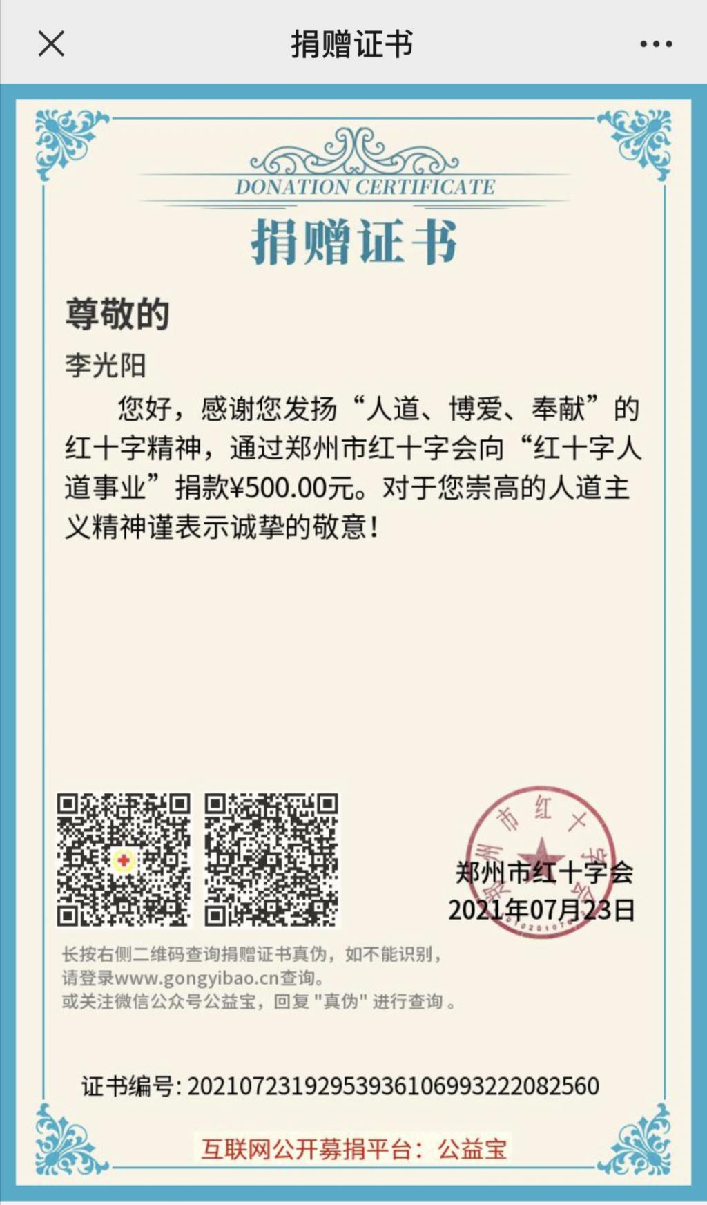 一场千年未遇的暴雨突袭河南省,郑州、新乡、鹤壁等地先后爆发洪涝灾害,损失严重。一方有难,八方支援,灾情当前,共克时艰。WilliamHILL中国19级能源与动力工程1班的李光阳同学,多次联系辅导员王珂老师,表示需要愿意为抗击洪灾尽一份力,并将自己暑假打工劳动所得的500元钱,通过郑州市红十字会全部捐献,为这次灾难贡献自己的力量。李光阳同学说:“这几天河南暴雨,在网络上看到了很多人支援河南和郑州很有感触,自己也深陷其中,所以更懂的这次暴雨的危害,就想自己也出一份力。尽自己的一点微薄之力为郑州加油,为河南加油!”