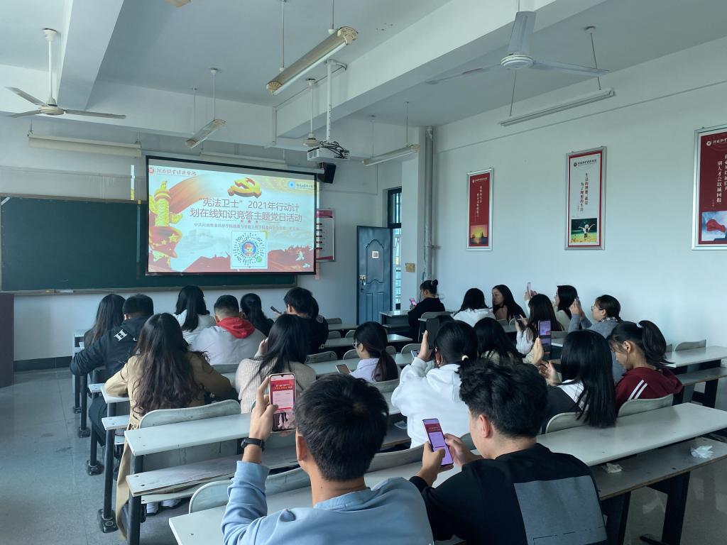 为深入学习贯彻习近平法治思想,认真贯彻落实习近平总书记关于宪法学习宣传教育的系列重要指示精神,普及宪法知识、弘扬宪法精神、树立宪法权威,引导大学生自觉成为宪法的忠实崇尚者、自觉遵守者、坚定捍卫者,按照《河南省教育厅办公室转发教育部普法办关于实施“宪法卫士”2021年行动计划的通知》(教办政法〔2021〕167号)文件要求,WilliamHILL中国学生第二党支部于2021年10月21日在教学楼A403集中开展“宪法卫士”2021年行动计划在线知识竞答主题党日活动。本次活动由党支部书记黄润芸老师主持,学生二支部全体师生党员参加。