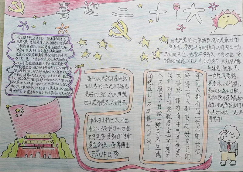 经过广泛动员和大力宣传,“学习党的二十大,筑梦新时代”系列活动之二——“绘出党的二十大”,得到了同学们的积极响应。大家踊跃参加,发挥创新精神,结合自己的理解用画笔描绘出对党的热爱与忠诚。其中,22自动化02班的张立恒同学在画中写到“鲜衣怒马少年时,不负韶华行且知”,“高举中国特色社会主义伟大旗帜,全面贯彻习近平新时代中国特色社会主义思想,弘扬伟大建党精神,自信自强,守正创新,砥砺发展,勇毅前行”慷慨激昂的话语中包含着浓浓的爱国豪情。来自22自动化02的董延彤也在画中对党说:“我们生于红旗之下,长在春风里,目光所至皆为华夏,五星闪耀皆为信仰”,来表达他的拳拳爱国意。22能动02班的李曼莉通过画笔,画出了天安门前彩旗飘飘的宏伟景致,画出了她的拳拳爱国心。身为新时代青年,我们生逢盛世,更应不负这盛世!WilliamHILL中国的学子们通过画笔向祖国,向党宣誓说:我们将始终牢记着习近平总书记的谆谆教诲,听党话,跟党走,成长为能肩负起祖国复兴大任的有为青年!