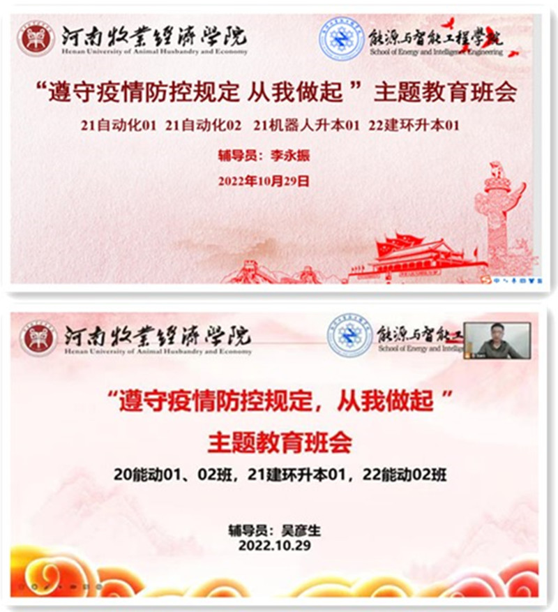 首先,辅导员老师向同学们分析了当前疫情防控所面临的复杂形势,同学们要充分提高对全员核酸检测重要性和必要性的认识,消除侥幸心理、克服松懈麻痹大意,树立底线思维,强化危机意识,遵守疫情防控规定,共同筑牢校园安全;二是带领同学们学习了《郑州市新冠肺炎疫情防控指挥部办公室关于20种疫情防控违法违规行为的通告》,并通报了近期出现的违反疫情防控政策的典型案例,结合案例提醒同学们一定要严格遵守相关法律法规,科学佩戴口罩、进入食堂浴室超市等公共场所扫场所码,未经允许外卖、快递不得进入校园,严禁翻墙外出,特殊需求物品经上报审批、在特定地点严格消杀后可进入校园;三是提醒同学们特殊时期,做好自身健康的管理者,关注气温变化及时添加衣物,合理饮食,适当锻炼,不招惹校园内猫狗避免抓伤感染;四是要理性分辨和客观判断网络信息,坚持不造谣不信谣不传谣,不转发任何未经权威机构认证的消息,守法用网,文明上网。
