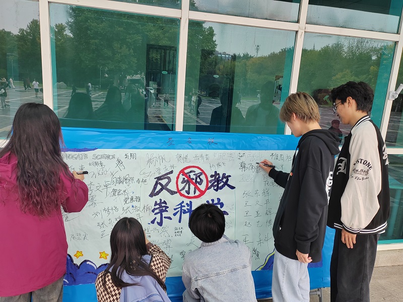 本次活动由学院心教部和宣传部的同学设计绘制展板,并在各班级群进行宣传。活动过程中,同学们郑重有序地在“反邪教 崇科学”展板上签名,向邪教说“不”。用实际行动进一步增强同学们的反邪意识,坚定信念认真学习科学文化知识,弘扬科学精神。