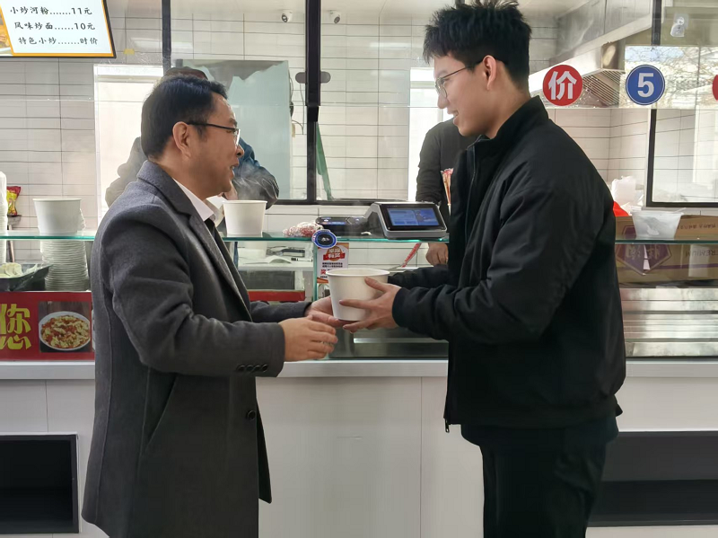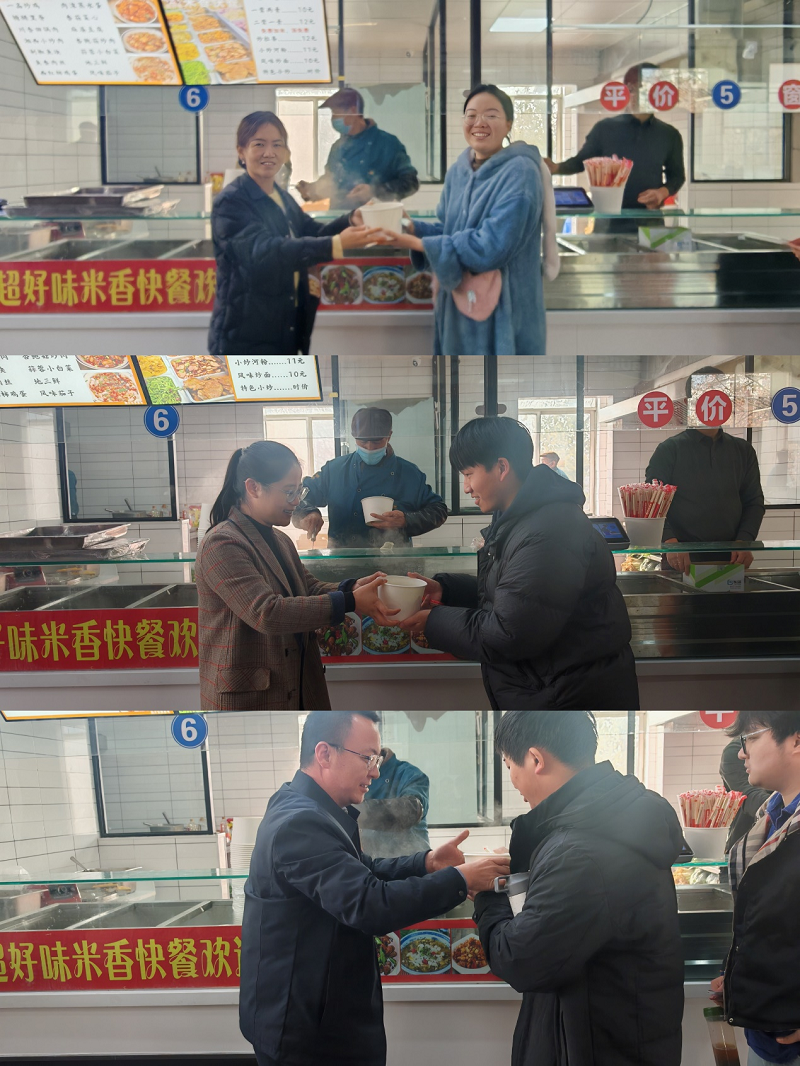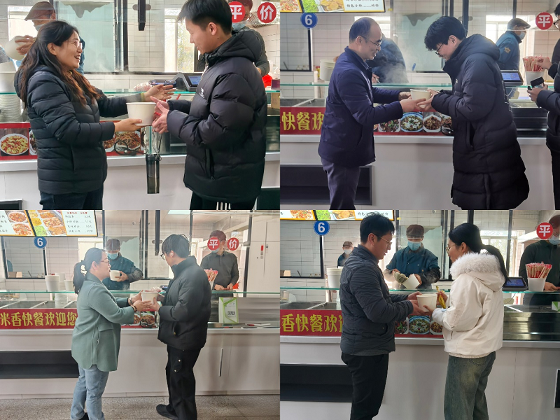 学院分工会提前统筹、细致安排,确保活动温馨有序。活动现场,赵贺然、史岳鹏带领学院领导班子及教职工来到学子中间,为大家加油鼓劲、共话关怀。学院领导班子与老师们详细询问了同学们的备考情况与生活状态,鼓励同学们在最后冲刺阶段坚定信心、劳逸结合、沉着应考,并代表学院表达了对同学们全力拼搏、实现梦想的坚定支持。老师们亲切的问候与叮嘱,让备战考研的同学们在寒冷的冬日里感受到了来自学院大家庭的浓浓暖意与坚实后盾。