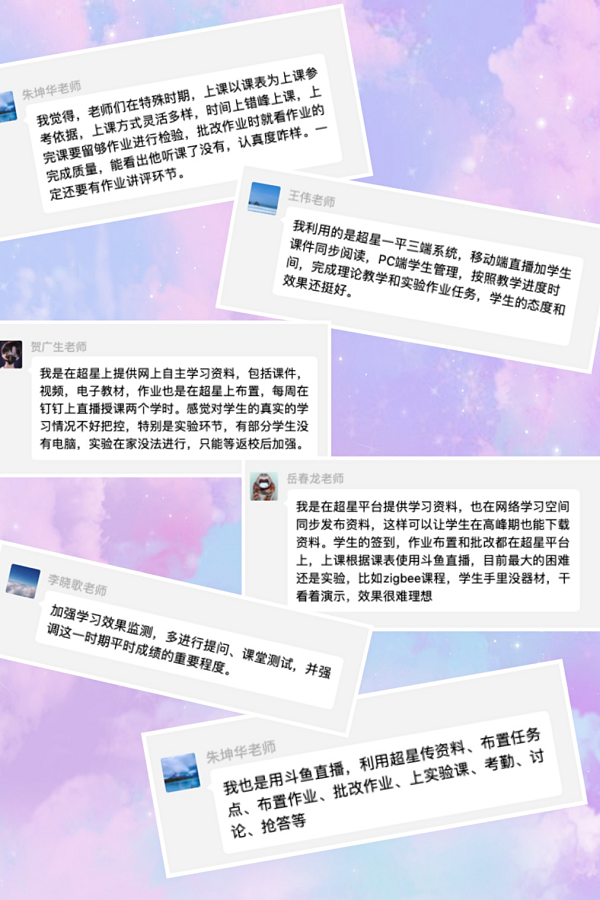同学们听课时一般采用“手机+电脑”的方案,但是作为老师有些细节还是必须要考虑:网络翻车怎么办?环境嘈杂怎么办?经过多方位讨论和考查,老师们课程模式采用了学习通+斗鱼+微信群的在线授课模式,一方面让学生身临其境,沉淀知识,另一方面能够及时反馈,频繁互动。在学习通突发拥堵的情况下,老师也可以一边维护课堂秩序,一边及时协助启动斗鱼等直播平台应急预案。真的无法跟上直播的学生,还可以看视频回放。保证了整个教学过程流畅顺利,学生反映良好,这也为我们今后的网上教学积累了经验,增强了信心。