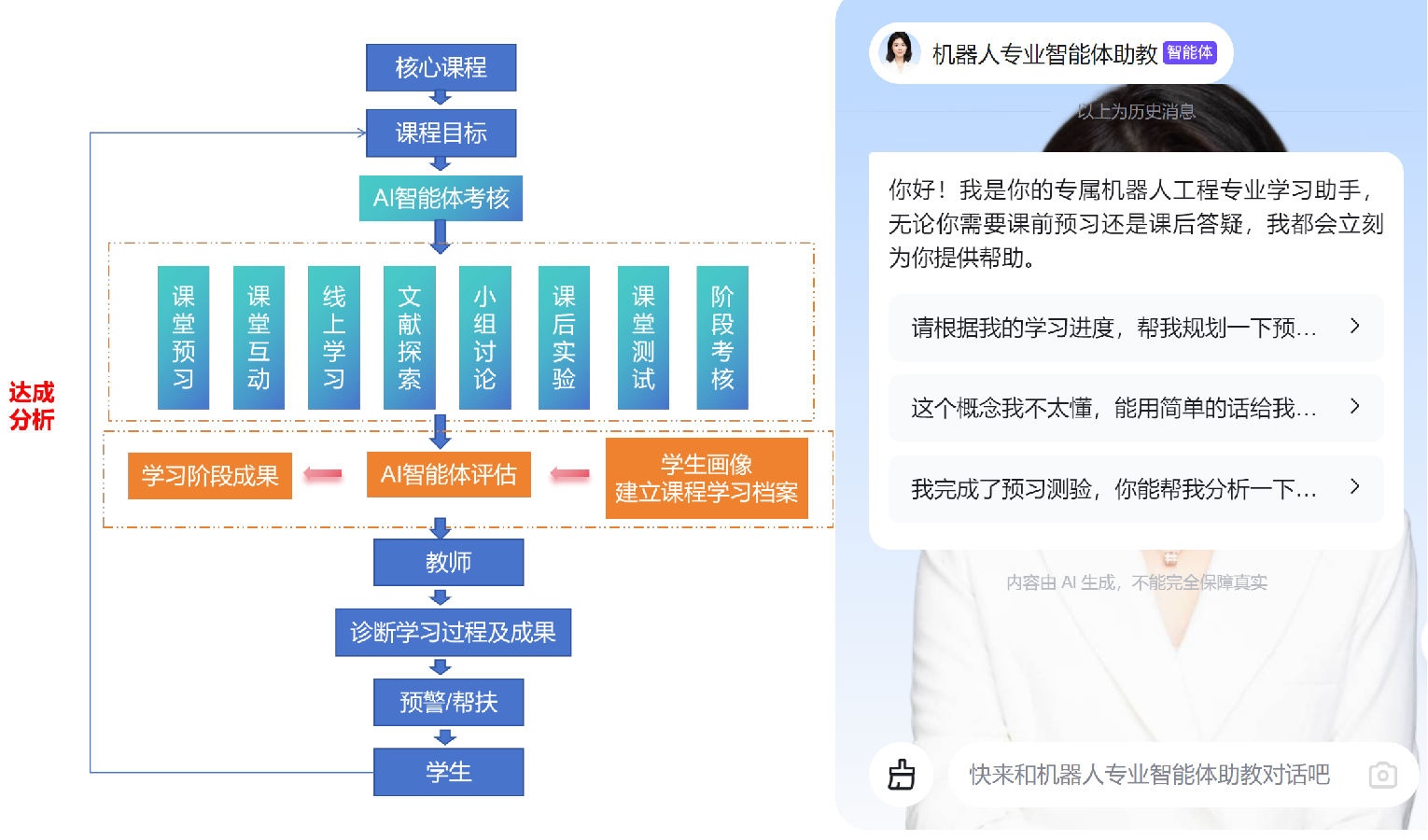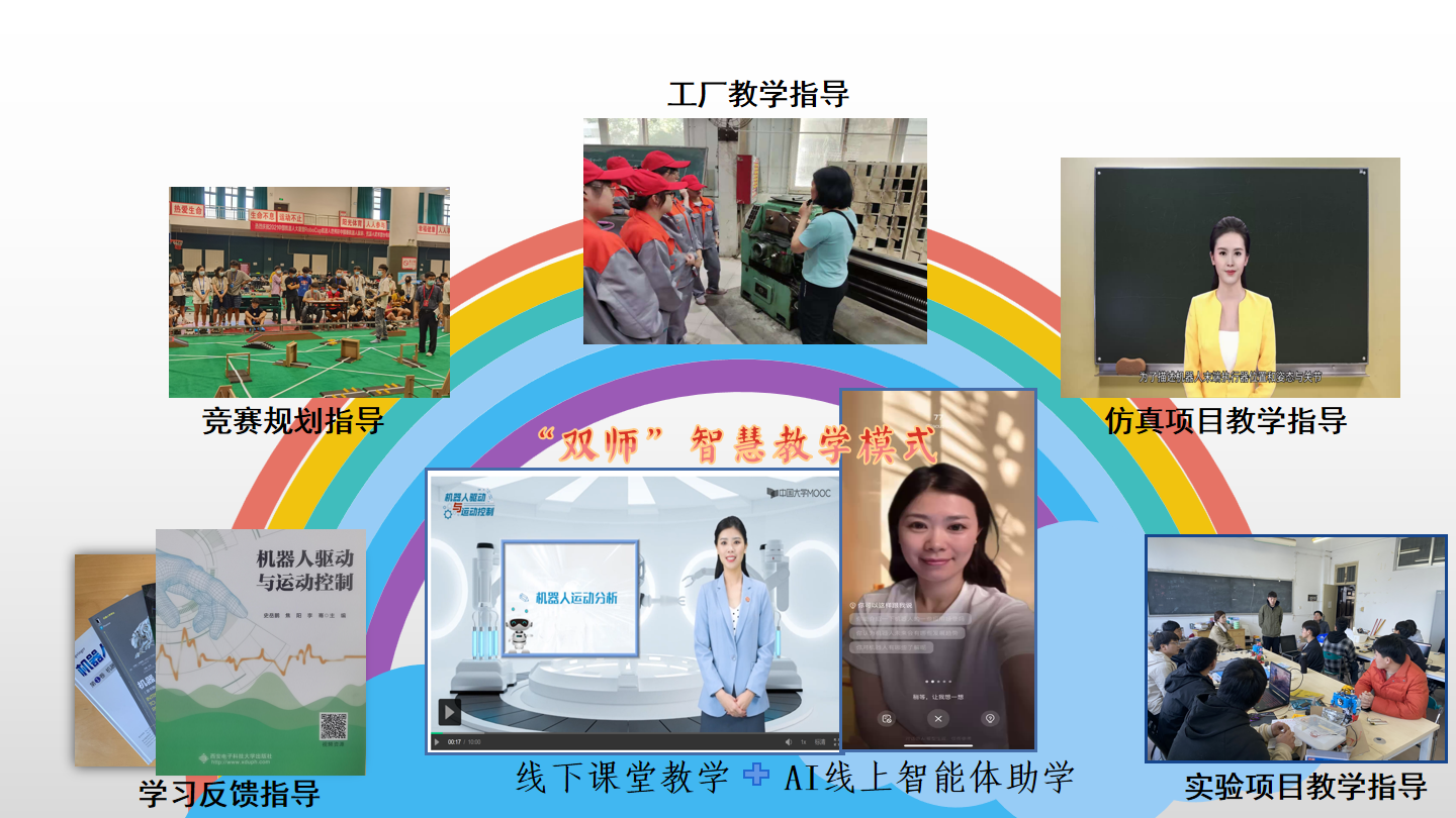 (1)教育理念创新:提出了基于AI智能体技术的“课堂-实验-项目-竞赛-仿真-工厂”一体化智慧教学模式。打破了传统工科教学的界限,实现了AI智能体从理论到实践、从课堂到工厂的全链条覆盖。实现了线上线下“双师”虚实结合协同教学,通过“一人二师”个性化引导学生学习。