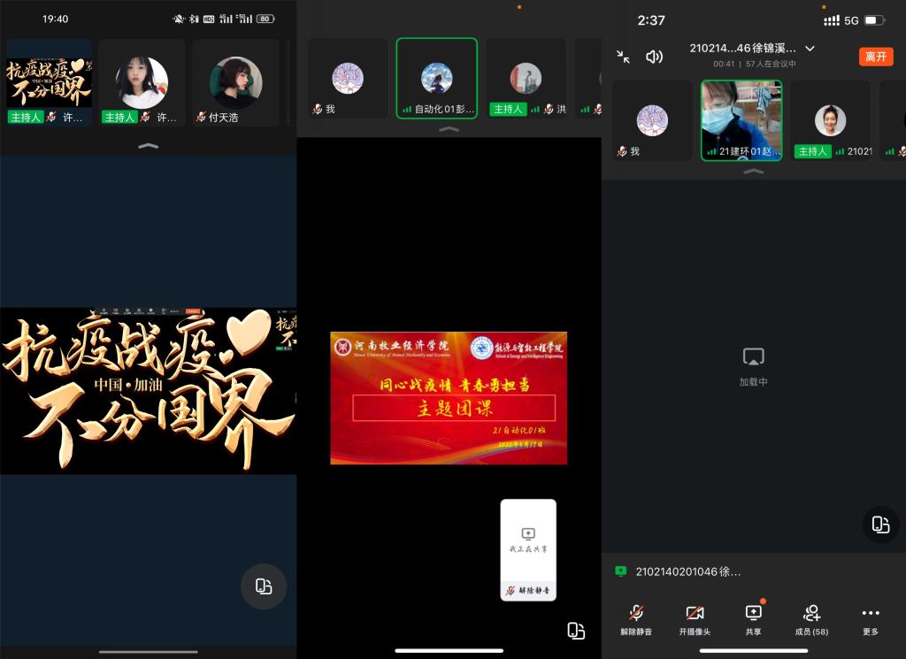 团课开始前,各班同学都自觉关闭麦克风,共同维护本次团课的良好氛围。团课伊始,在各班团支书的引领下,许多同学根据自身了解发表了各自的看法与期望。21级能动01班的李军印同学分享了自己的抗疫故事,他引用黑格尔的话:“一个民族要有一群仰望星空的人,才有期望”表达了自己内心对奋战一线的医护人员的敬佩。在各位同学的精彩发言结束后,各班团支书对团课进行最后的总结,并向同学们讲述当前防疫状况,带领同学们学习正确疫情防控知识,呼吁大家自觉遵守学校规定、规范自身行为,携手同心为构建抗疫“长城”献出自己的力量。