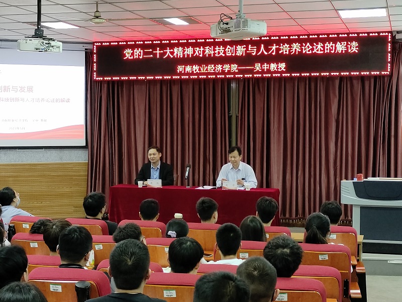吴中从“三个方面加深认识‘三位一体’”、“我国发展面临的新的战略机遇,深刻把握全面建设社会主义现代化国家面临的形势”以及“如何成为创新型人才,创新型科技人才需要具备四个特质”三个方面全面系统的阐述了科技创新与人才培养的时代新内涵。吴中指出,一要深刻理解主题教育的重大意义,学出思想真谛,坚持读原著、学原文、悟原理,做到内化于心、外化于行,把党的创新理论转化为实践伟力;二要全面把握习近平总书记对教育、科技和人才重要论述的深刻内涵,结合学院在“牧工商一体化”中工的特点,守正创新、自立自强,牢牢把握百年未有之大变局,为高质量发展塑造新动能;三要持续培养创新型人才,广大青年学生要牢记习近平总书记的殷切希望和谆谆嘱托,踔厉奋发,勇毅前行,努力成为创新型科技人才,学好知识、练好技能,让青春在党和人民最需要的地方绽放光彩。