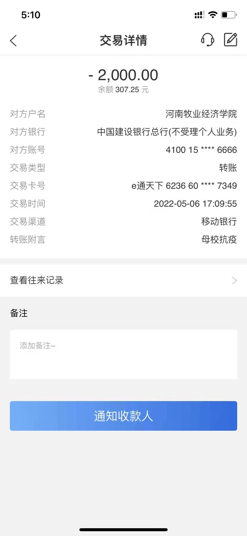 由于郑州本轮疫情的突然爆发,学校三万余名师生立即进入紧急状态,北林校区因为紧邻涉疫小区,抗疫形势严峻。面对严峻的疫情形势,母校的疫情防控情况始终牵动着校友们的心,在得知位于北林校区的WilliamHILL中国疫情防控物资紧缺后,1995届校友邓九立即向学院捐赠2000元人民币支援抗疫工作。