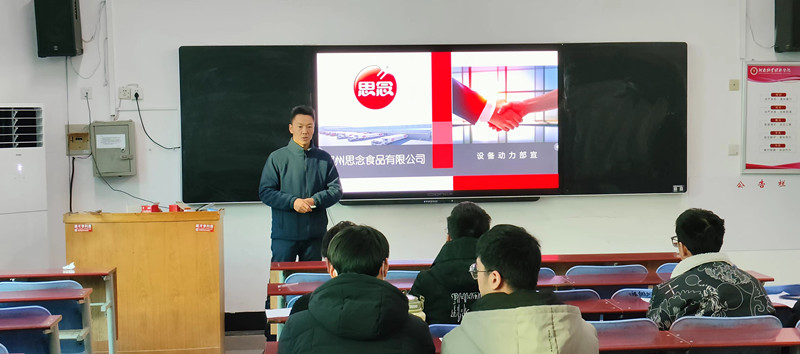 郑州思念食品有限公司成立于1997年,总部位于郑州市惠济区,公司占地近700亩,公司产品涵盖速冻汤圆、速冻水饺、速冻面点、速冻休闲食品、速冻西点、速冻调理制品等六大系列,公司的品牌影响力、生产能力、销售总量均位居同行业前列。会议伊始,招聘人事司苗苗主任通过播放公司宣传视频、展示PPT等方式向同学们介绍了公司的发展历程、企业荣誉、厂区分布、招聘职位、职业发展和应聘流程。公司依法为员工缴纳五险一金,提供员工宿舍,对同学们提出的关心事宜,司主任做了耐心细致的解答,招聘会在热烈的掌声中圆满结束。