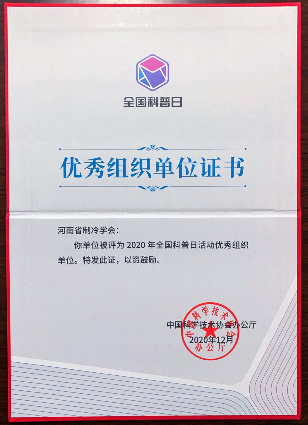 依据《中国科协办公厅关于对2020年全国科普日有关组织单位和活动予以表扬的通知》内容,热烈祝贺河南省科学技术协会、河南省制冷学会等单位被评为2020年全国科普日活动优秀组织单位。