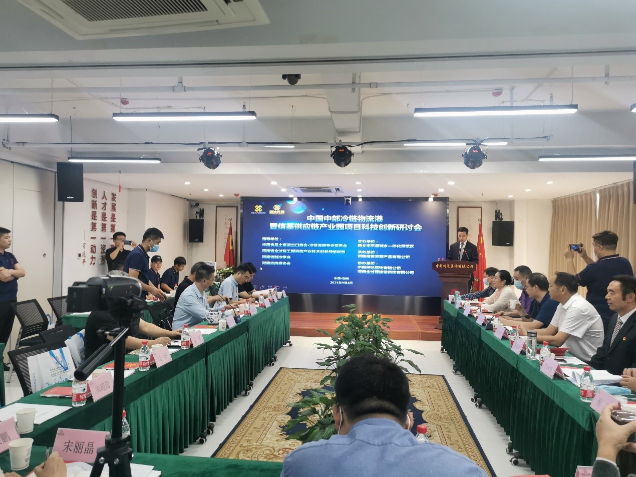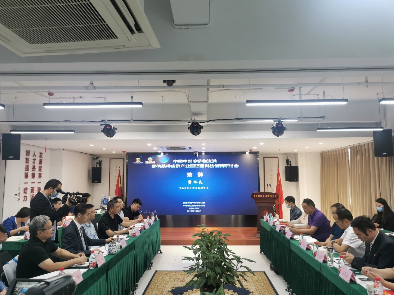 2021年9月4日下午,中国中部冷链物流港暨信基供应链产业园项目科技创新研讨会在郑州市高新区召开,新乡市平原城乡一体化示范区管委会副主任高芳春、中国食品土畜进出口商会冷链流通专业委员会执行理事长江波,河南省肉类协会会长刘承信,信基公司董事长李喜庆以及国内多名行业专家、学者、企业家出席会议。河南省制冷学会作为本次会议的指导单位,贾丰良副理事长、刘群生副秘书长、王军理事参加了会议。