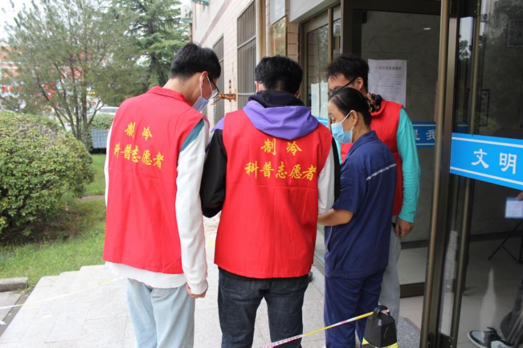 科普讲座结束后,40多名学生志愿者在老师带领下,先后来到河南理工大学校园、校医院、餐厅、宿舍、后勤维修中心等场所进行了科普宣传,分别向老师、员工、学生等分发了《制冷与健康》、《科学使用电冰箱》、《家用空调自助清洗全攻略》、《电梯逃生手册》等科普资料,使更多的人懂科普、爱科学。
