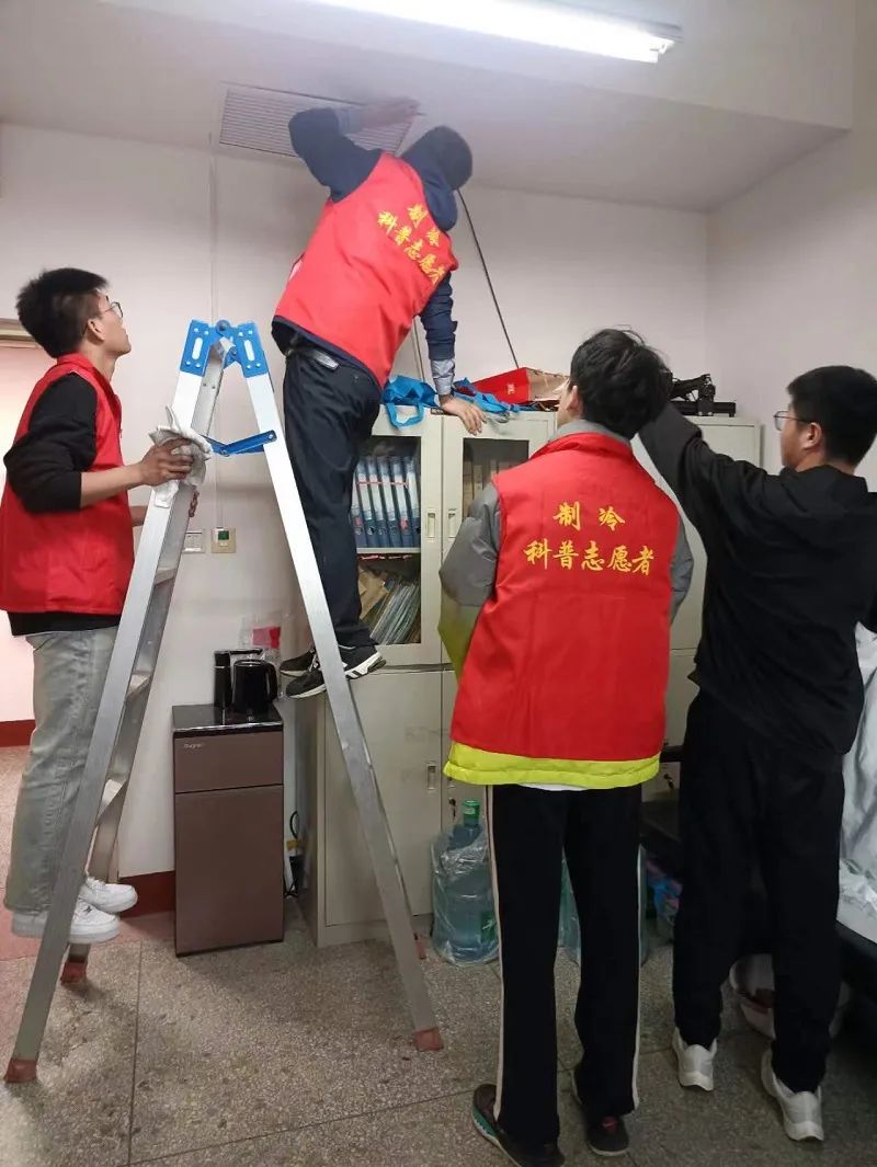 科普活动结束之后,河南省制冷学会志愿者服务队对原阳县科协、原阳县妇联办公室等办公区域的中央空调进行了清洗,并对部分中央空调内机进行了维修。维修清洗过程中,志愿者们分工明确,擦洗中央空调出风口、拆卸滤网、清洗滤网、喷洒清洗剂、清洗空调内部、装回过滤网等,并将作业区域清理干净,恢复原样。