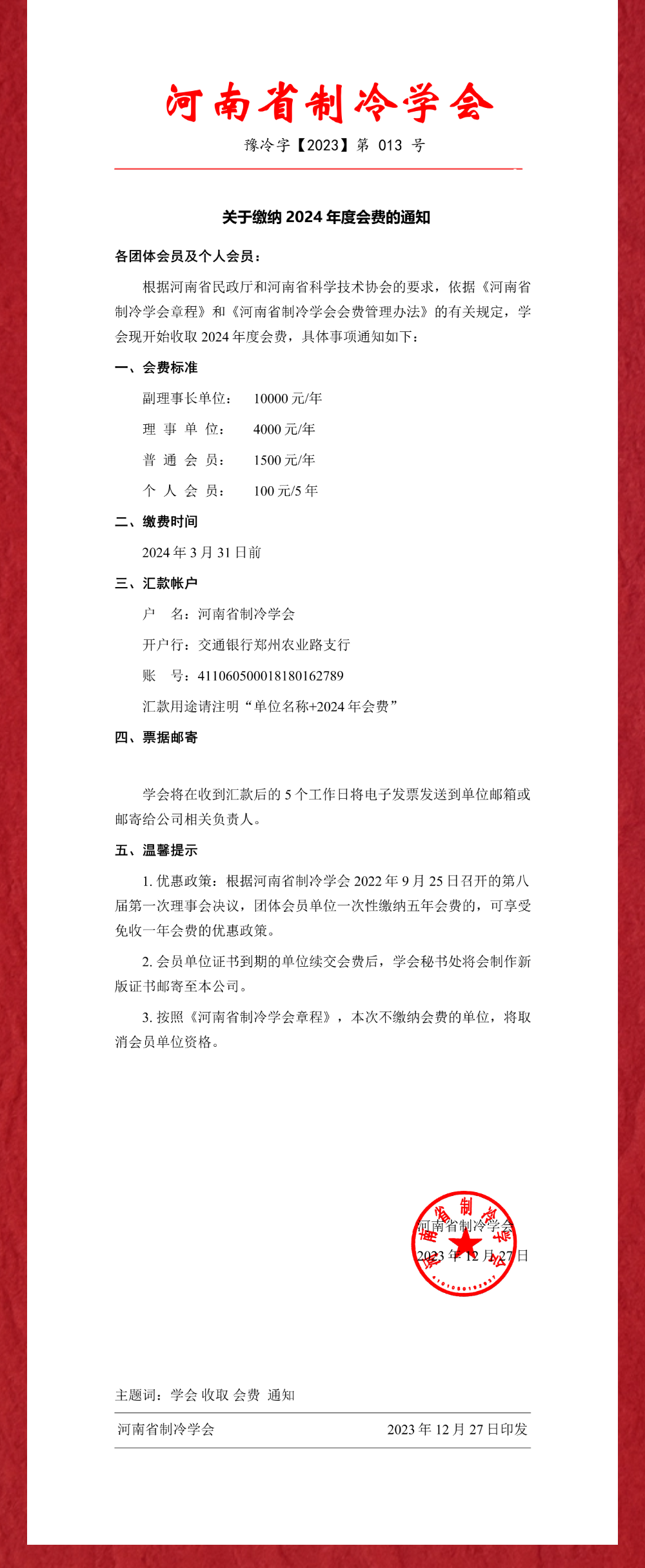 关于缴纳2024年度会费的通知