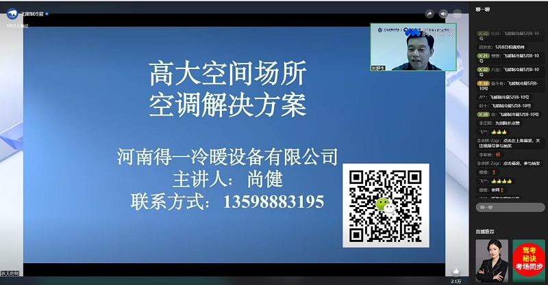 2024年4月29日,由河南省科学技术协会指导,河南省制冷学会和飞熊制冷展组委会联合主办的“百会链千企”云课堂第十四期,——“高大空间场所空调解决方案”顺利开播。本次活动特别邀请了河南得一冷暖设备有限公司总经理尚健担任主讲嘉宾,河南省制冷学会副秘书长刘群生主持。本次活动受到了业界同行的广泛关注,直播观看量超过了1500人次,为制冷行业的从业人员带来了一场精彩纷呈的知识盛宴。