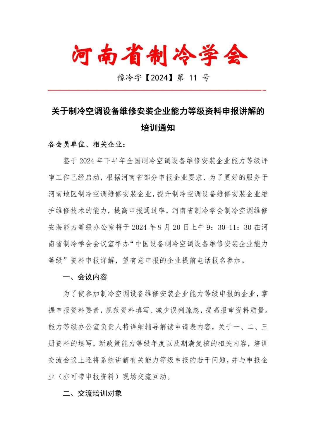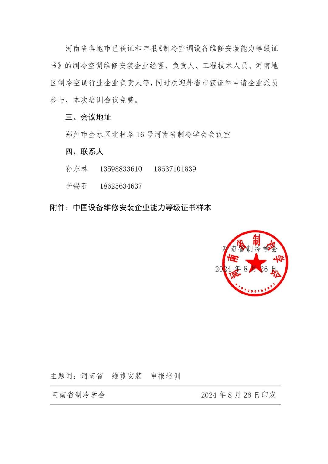 通知公告‖关于制冷空调设备维修安装企业能力等级资料申报讲解的培训通知