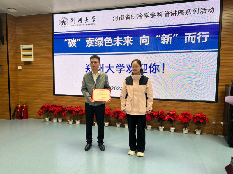 活动尾声,郑州第七中学的领导对河南省制冷学会及汤松臻教授的精彩讲座表示了衷心的感谢,并颁发了讲座证书,让学生们近距离接触科学,感受科技的魅力。同时,汤教授也寄语在场的学生,希望他们能够保持对科学的好奇心,勇于探索未知,为实现绿色、低碳、可持续的未来贡献自己的力量。