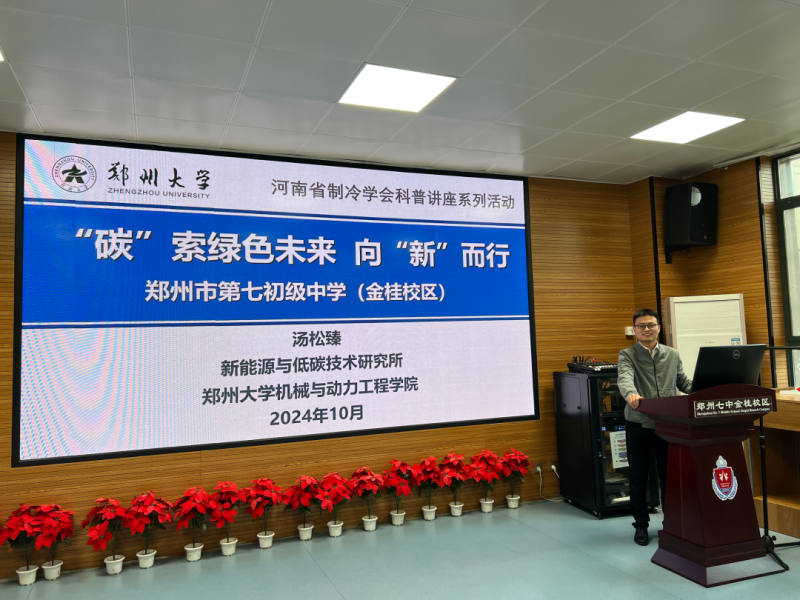 河南省制冷学会特别邀请了学会理事、河南省青年托举人才、郑州大学教授汤松臻博士,为师生们呈现了一场题为“‘碳’索绿色未来 向‘新’而行”的精彩科普讲座。此次讲座不仅是制冷科技的一次生动展示,更是对未来可持续发展路径的一次深刻探讨。
