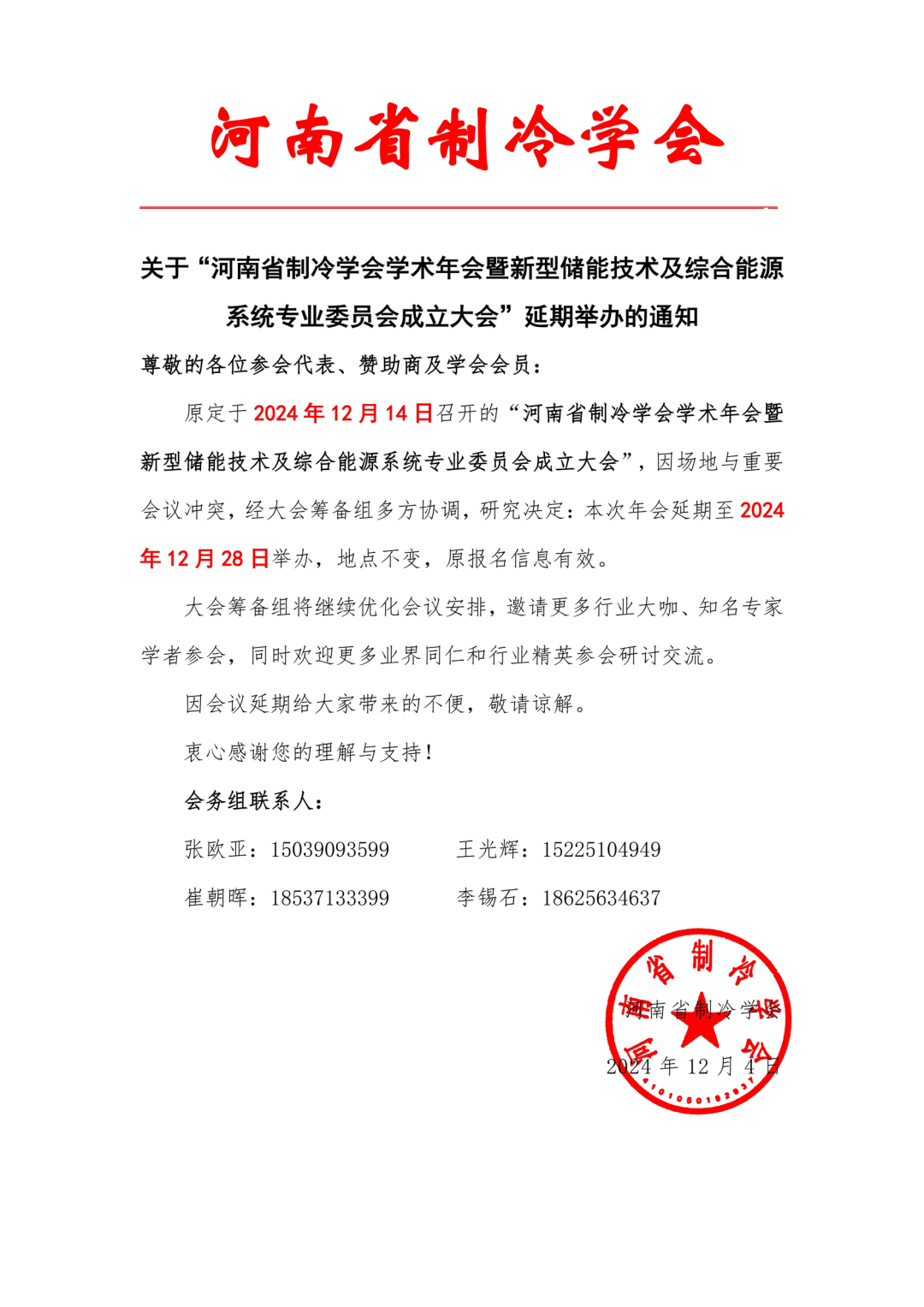 原定于2024 年 12 月 14 日召开的"河南省制冷学会学术年会暨新型储能技术及综合能源系统专业委员会成立大会",因场地与重要会议冲突,经大会筹备组多方协调,研究决定:本次年会延期至2024年12月28日举办,地点不变,原报名信息有效。
