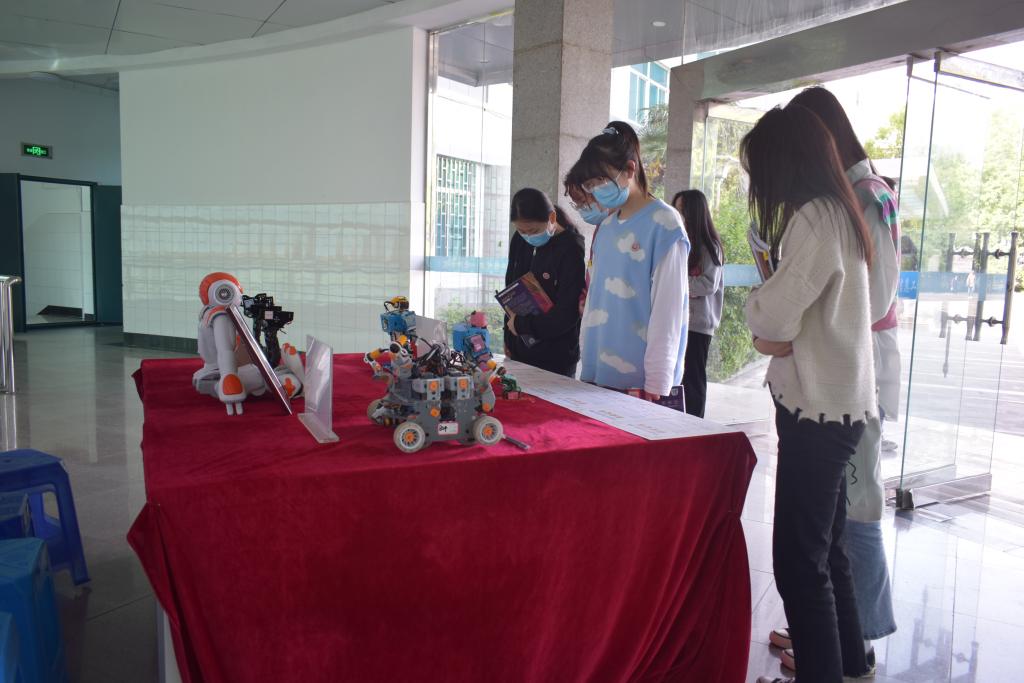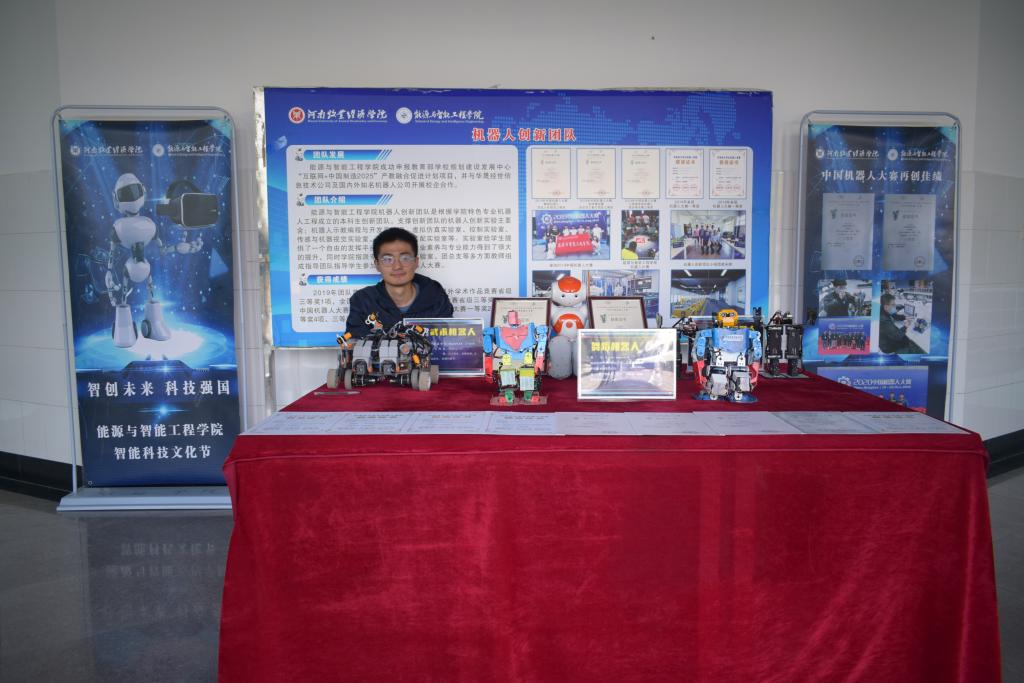 展示大致分成三部分:学院机器人创新团队发展介绍、机器人获奖作品展示、机器人大赛获奖证书展示。展台上有序摆放了我院学生自主设计的武术机器人、竞步机器人、舞蹈机器人等创新机器人和一系列中国机器人大赛获奖证书、河南省大学生机器人竞赛获奖证书。讲解同学带领大家走近机器人,详细讲解每个机器人的构造原理、结构组成和应用特长,还进行了生动形象的现场演示,在一定程度上帮助同学们提升专业素养。过往的同学被宣传物料和机器人展品所吸引,纷纷驻足,与讲解同学深入交流,咨询了解相关专业问题。