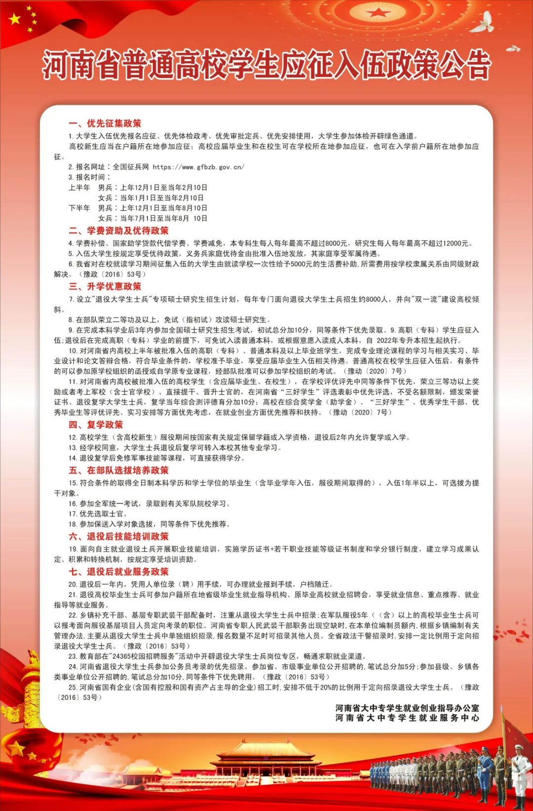 就业政策|河南省普通高校学生应征入伍政策公告
